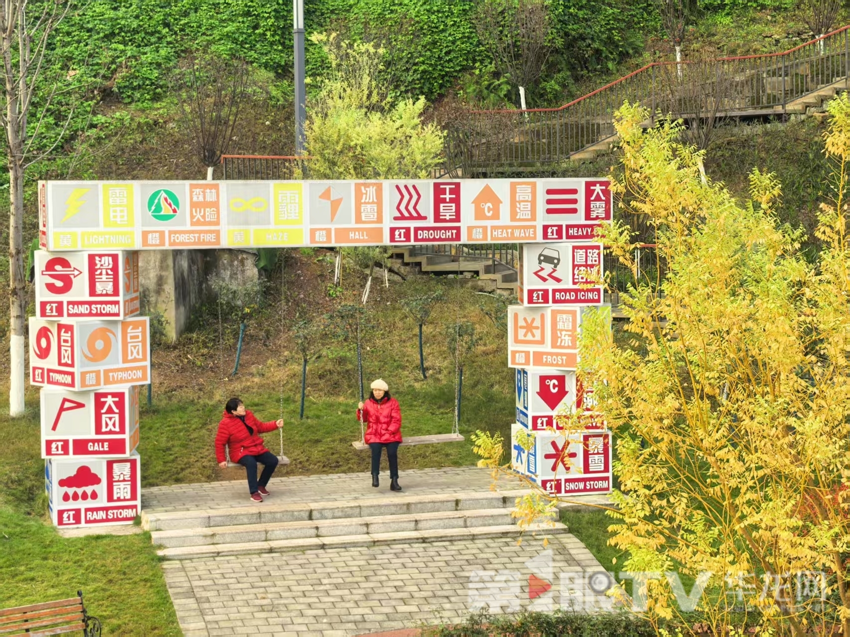 市民们坐在重庆智慧气象公园的秋千上,惬意地唠着家常。第1眼TV-华龙网记者 李舒 摄