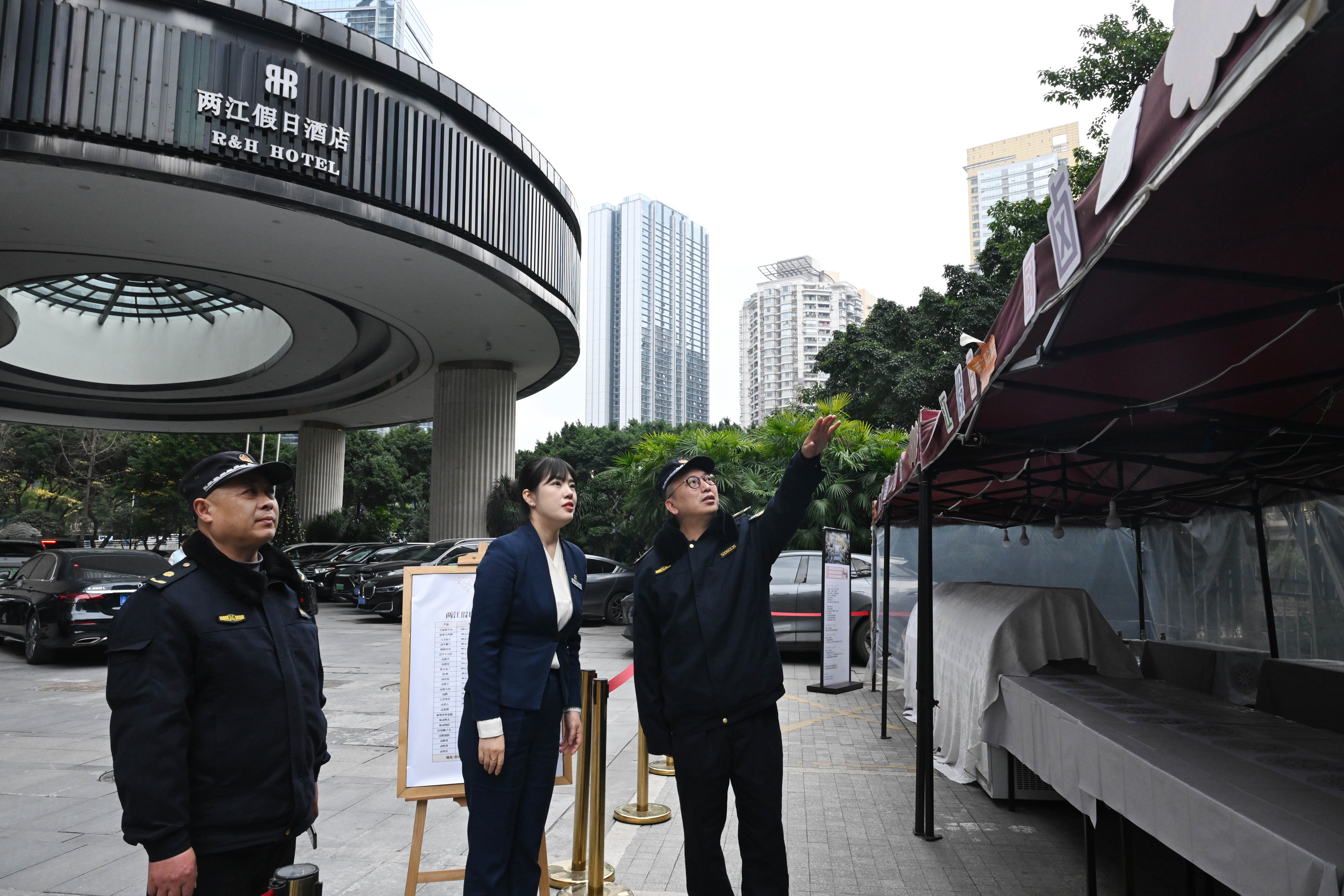 2025年12月26日,两江假日酒店门口,城市管理执法队员正在给酒店工作人员进行指导和协调沟通,让摊位更加整洁有序。记者 罗斌 摄