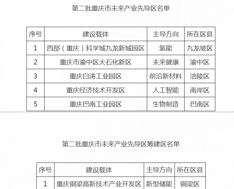 其中,九龙坡区九龙新城园区以氢能为主导方向,聚焦氢能制备、存储、运输、应用全产业链布局;渝中区大石化新区锚定未来健康赛道,依托中心城区医疗资源与都市经济优势,发力精准医疗、智慧康养、高端医疗器械等领域;涪陵区白涛工业园区深耕前沿新材料,依托化工产业基础,突破高性能材料、特种材料等关键技术;南岸区重庆经开区聚焦人工智能,推动人工智能技术与制造业、服务业深度融合;巴南区巴南工业园区发力生物制造,围绕生物基材料、生物医药等领域,推动生物制造技术成果转化与产业化。