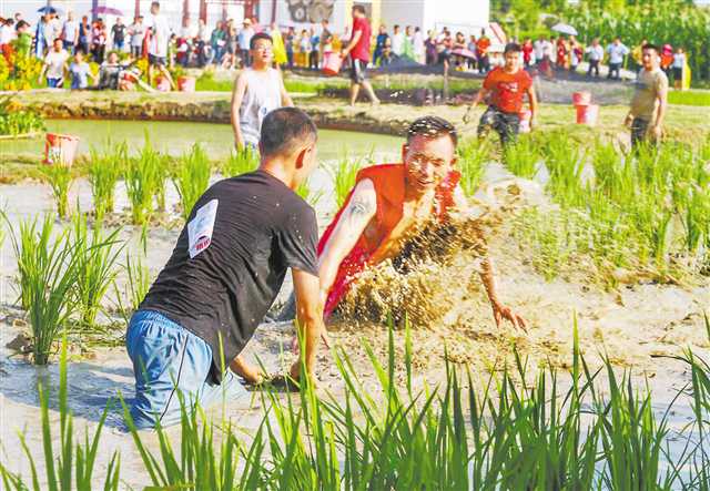 垫江县沙坪镇毕桥村举行的“乡愁文化季·乡愁之夏——千人稻田浑水摸鱼”全民狂欢活动上,游客在体验稻田摸鱼的乐趣。(本报资料图片)通讯员 向晓秋 摄/视觉重庆