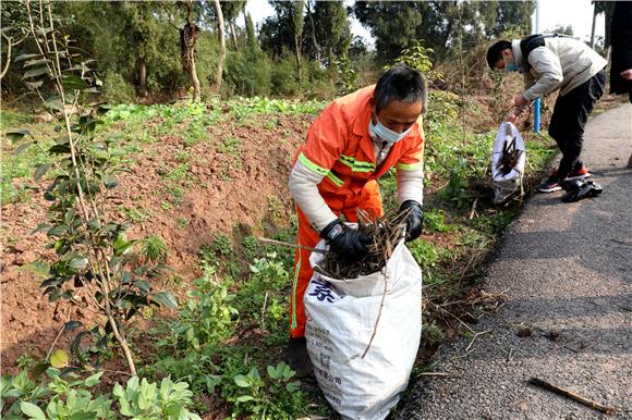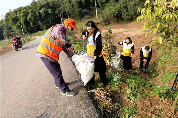 捡拾乡村道路沿线垃圾。特约通讯员 谭显全 摄
