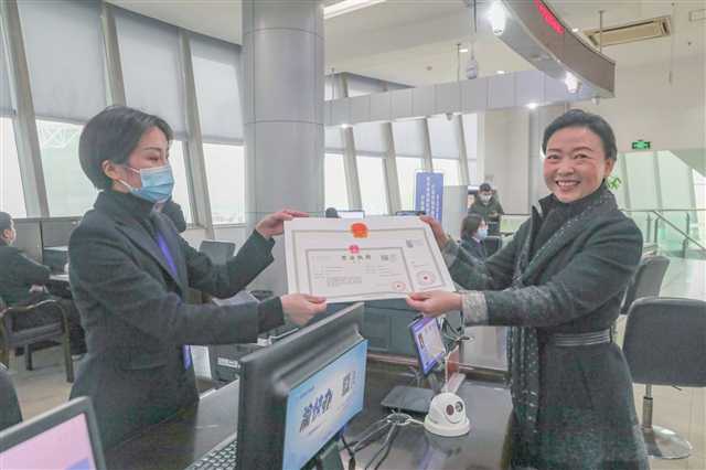 四川有声自远文化传媒有限公司的刘女士在江北区“川渝通办”服务窗口顺利领取了营业执照 摄/曹检