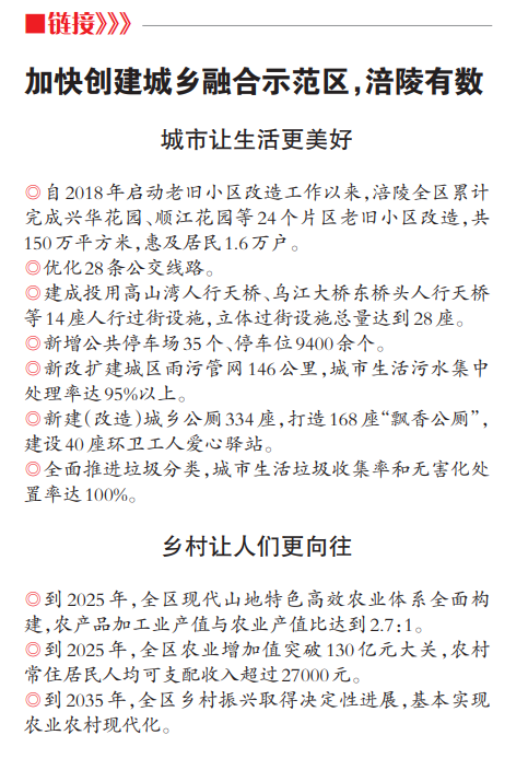 接下来,涪陵将深入推动乡村振兴,精心绘就城乡融合发展新画卷。坚持农业农村优先发展,强化以工补农、以城带乡,奋力推动乡村振兴实现新提升,加快建设城乡融合发展示范区。