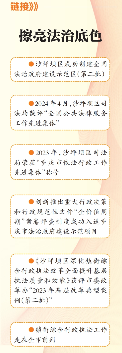 近年来,沙坪坝区在市司法局的支持下,坚持司法行政工作与党委政府中心工作深度融合,努力推动法治成为沙坪坝核心竞争力的重要标志,为全区贯彻新发展理念、推动高质量发展、创造高品质生活、实现高效能治理提供坚强法治保障,取得了阶段性成效。