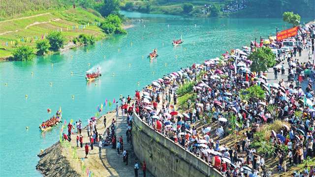 彭水郁山镇举行龙舟竞赛,参赛选手正划着龙舟奔赴参赛现场