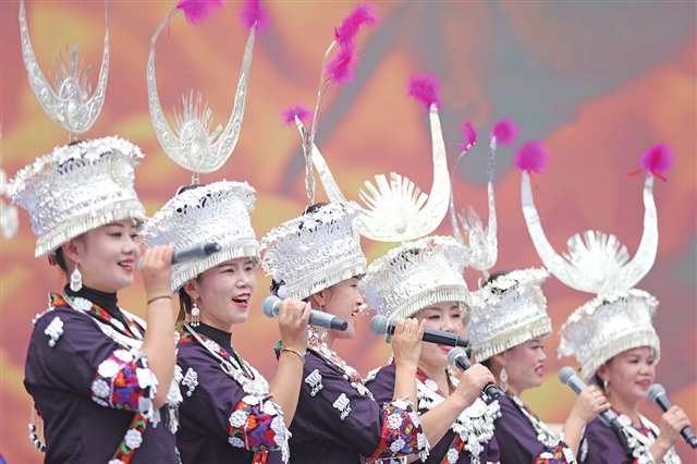 在彭水蚩尤九黎城景区,演员们正在给游客表演独具苗乡特色的歌舞