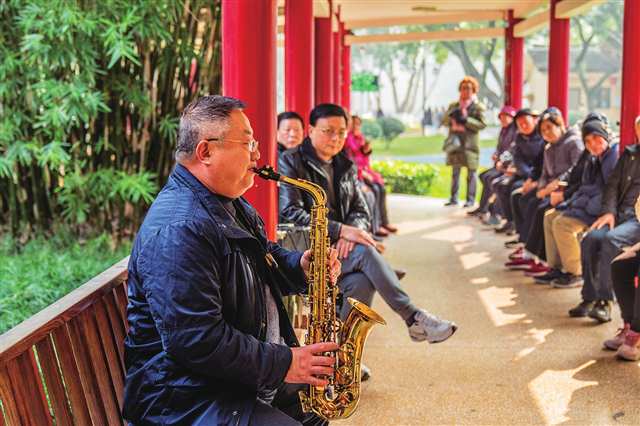 大渡口公园,市民正在吹奏萨克斯 摄/刘映呈