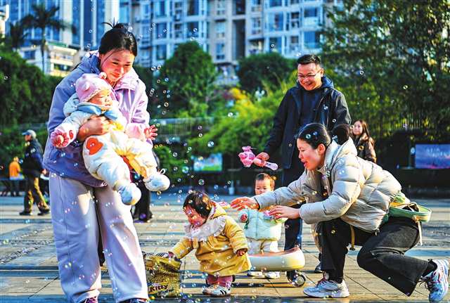 父母带着小朋友在广场上晒太阳玩泡泡 摄/齐岚森