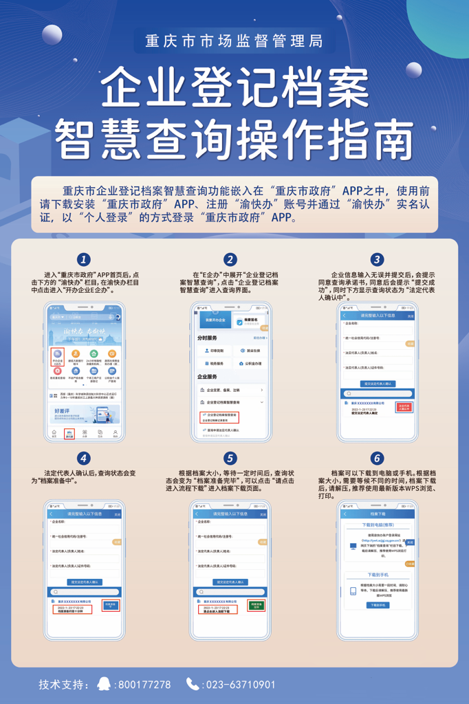 据介绍,智慧档案查询系统依托“渝快办”网上办事大厅,衔接企业登记全程电子化系统,打通了企业开办事项全程电子化服务的最后一一个环节,实现了企业登记资料网上提交、审核,登记结果网上查询、下载。企业登记档案查询申请人只需下载安装“重庆市政府”APP,注册“渝快办”账号并通过“渝快办”实名认证后,就能使用网上自助查询功能,输入需要查询企业的信息,经过法定代表人确认后即可下载加盖电子印章、具备与纸质件同等法律效力的企业登记档案。