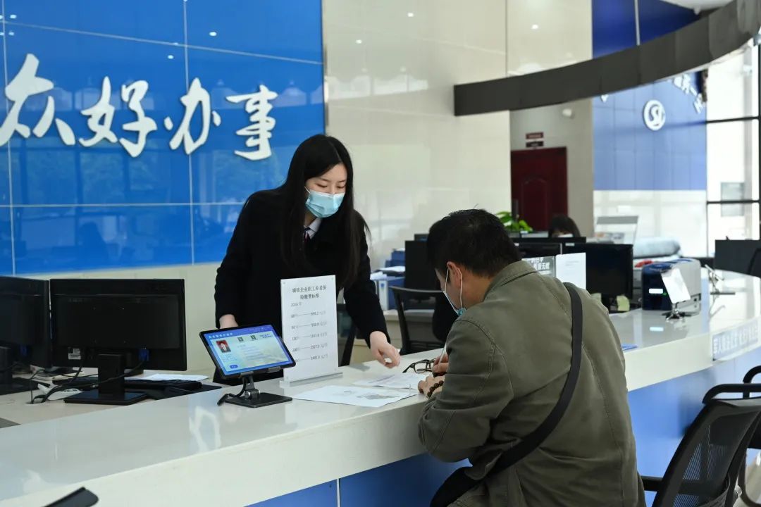 江津区圣泉街道公共服务中心综合窗口工作人员正在为市民办理业务。