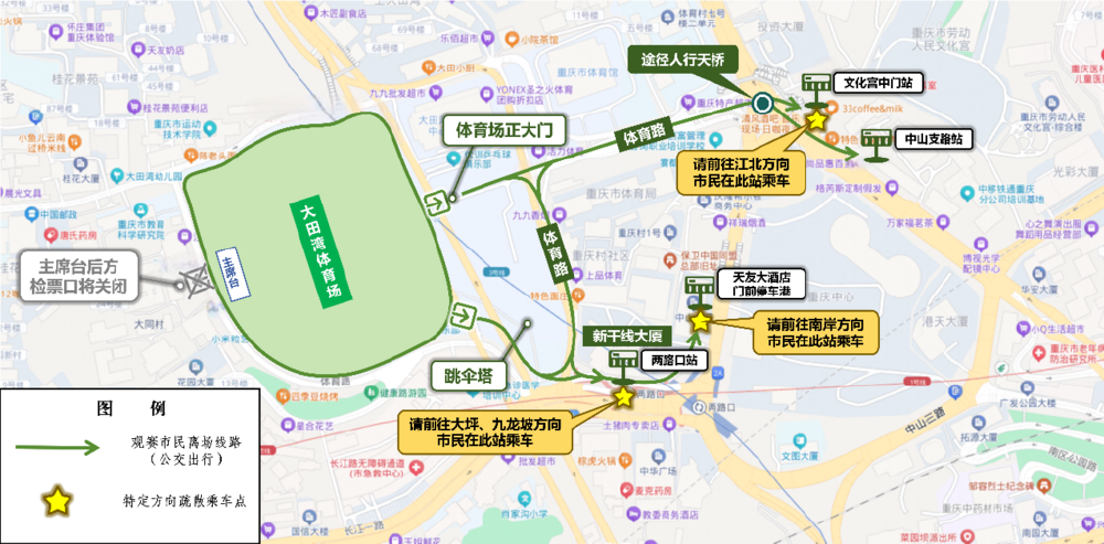 两路口环道周边部分公交线路将延时收班,乘车观众可步行至正大门/跳伞塔→就近公交站乘车。