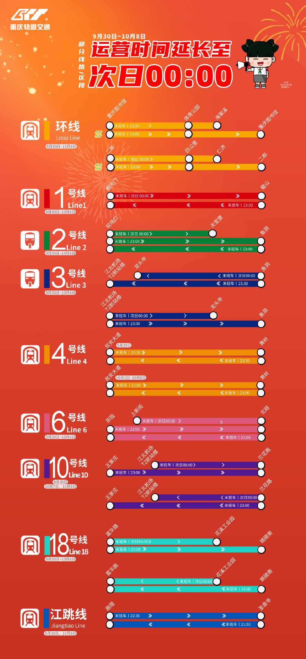 当国庆遇见中秋,8天的超长假期来了!为保障市民、旅客假期出行安全便捷,重庆轨道交通已优化全线网运营组织延长运营时间、升级运能配置,具体调整如下: