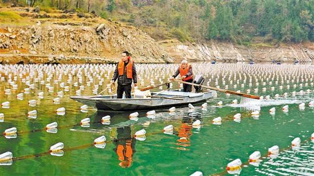 酉阳官清乡金家坝水库,工人们正在查看蚌苗生长情况。通讯员 段成军 摄\视觉重庆