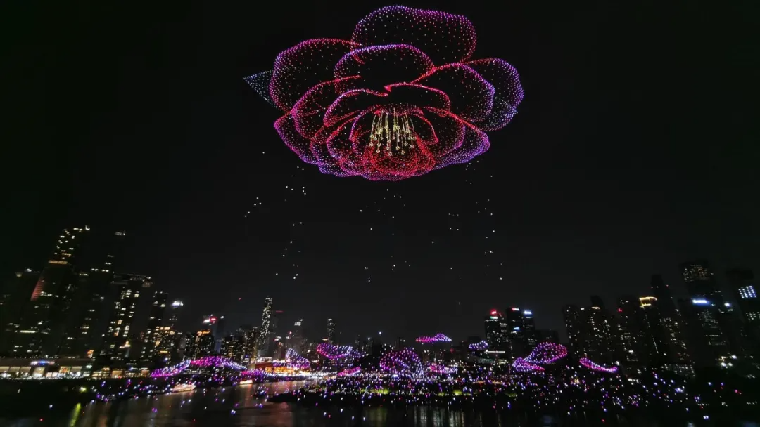 仰看空中,穹顶山茶花从中心花蕊逐层向外绽放,江面上粉色的花瓣宛如一条粉色的星河,在两江交汇处轻轻荡漾,这是独属重庆的优雅与浪漫,也是对远道而来的客人最诚挚的欢迎。