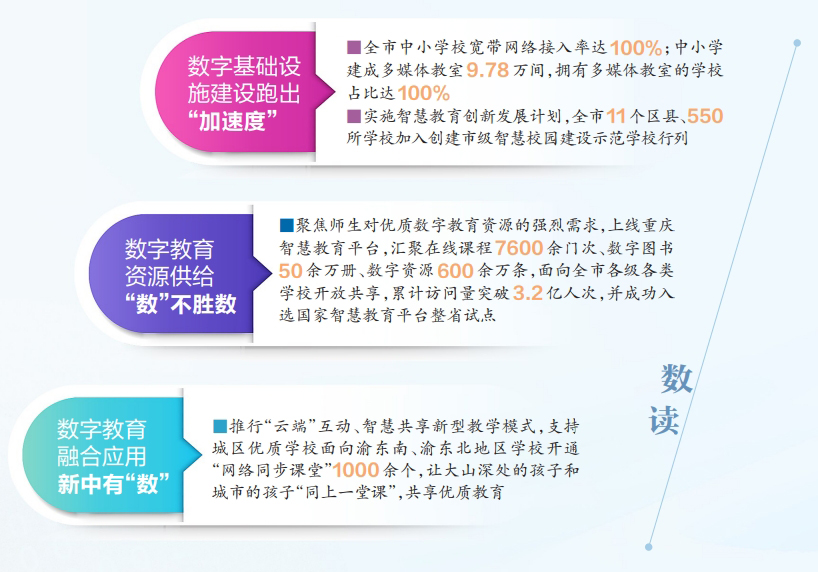 触摸数字中国建设脉搏,与数字重庆建设同频跃动,重庆教育因时而进、因势而新。近年来,全市教育系统纵深推进国家教育数字化战略行动,加快构建数字教育“1351”智治体系(聚力夯实1个教育数字底座,构建“市—区县—学校”三级治理架构,推进5大核心业务数字化改革,打造1个智慧校园新生态),充分发挥数字教育赋能牵引作用,打通超大城市治理与教育治理融合通道,用心答好“教育民生卷”,助力新时代教育强市建设。