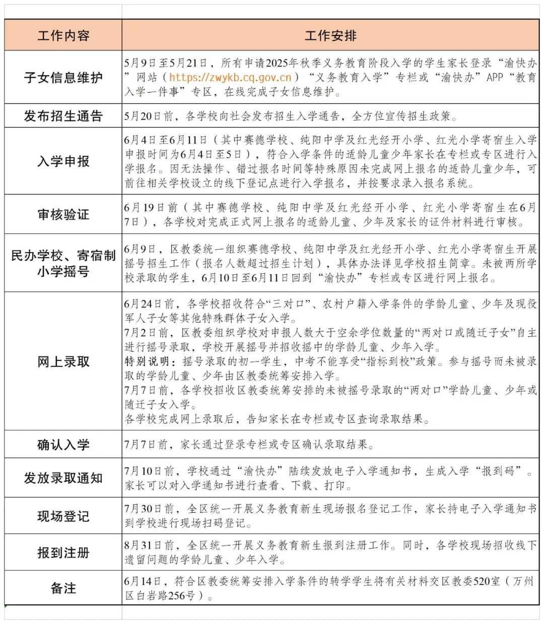 根据《重庆市教育委员会关于做好2025年义务教育招生入学工作的通知》精神,全面实施义务教育阳光招生,营造良好教育生态,结合我区实际,现发布《万州区2025年义务教育招生工作指引》。
