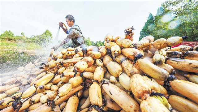 10月11日,垫江县砚台镇农光村莲藕基地,工人正在冲洗刚采收的莲藕。