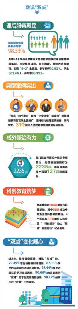 沙坪坝区对于校内改革、校外治乱、“家校社”协同、教育评价齐抓共建,入选全国校外培训治理十大典型案例;渝北区着力创新三种模式、强化三重保障、优化三个机制,“三三制”服务体系全力破解民生难题……上百个优秀区县、学校案例,涵盖校外培训治理、课后服务、作业设计、课堂改革、家校社协同共育各方面,不仅体现了各个单位敢于先行先试的“精气神”,勇于探索创新的“真本领”,而且展现出重庆教育减负提质、以变图强的蓬勃面貌:折射出重庆双减“减”有方向、“增”有质量的卓越功效。