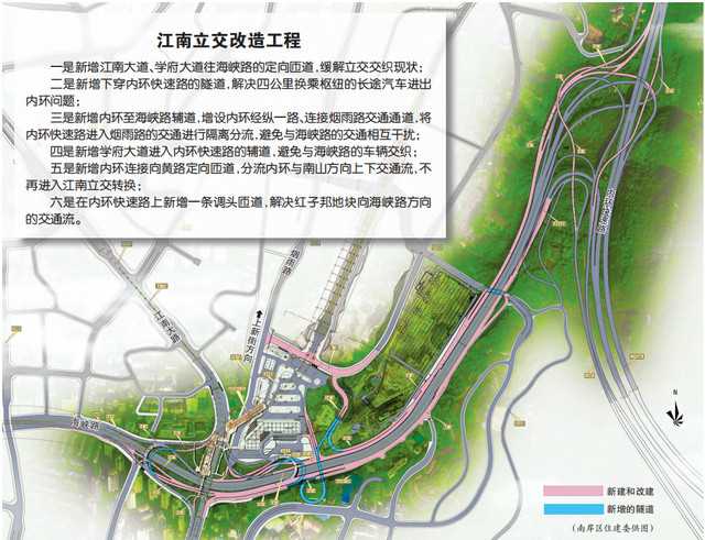 一是新增江南大道、学府大道往海峡路的定向匝道,缓解立交交织现状;