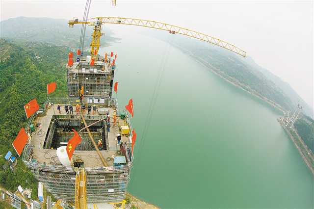 为最大限度减少施工对长江水体的影响,项目部构建起国内山区首座实施全生命周期BIM+技术应用体系,借助建筑模型对桥型调整优化进行攻关。北京、浙江等地专家组经过3次技术论证和精密计算,规避了北岸主塔原设计涉水施工难题,形成目前北岸两根主塔呈现“高低塔”的奇特效果。