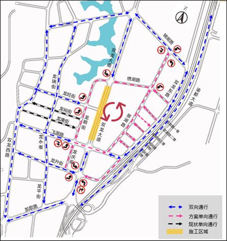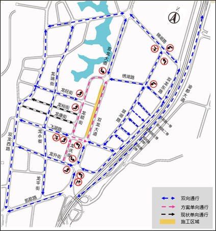 施工期间,封闭双龙大道(飞湖路-绣湖路段)由北往南车行道,龙顺街调整为单向行驶,形成逆时针循环;飞湖路(龙顺街-双龙大道段)、龙庆街调整为单向行驶,方便车辆快速疏解,减少交织。请根据现场引导标志谨慎驾驶。