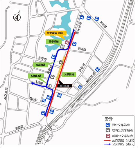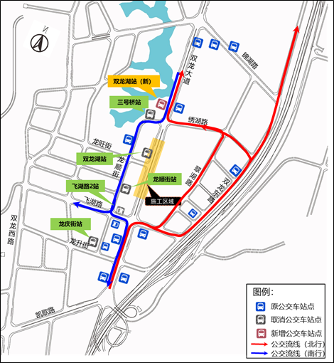 北行公交车停靠站点及路线保持现状不变。南行公交车绕行路径:双龙大道-龙顺街-飞湖路-双龙大道/双龙西路,绕行距离约750m(附图3)。公交站点方面,取消现状4处公交站:三号桥站、龙顺街站、飞湖路2站、双龙湖站;新增站点1处:双龙湖站(新) ,具体公交信息以公交公司为准。