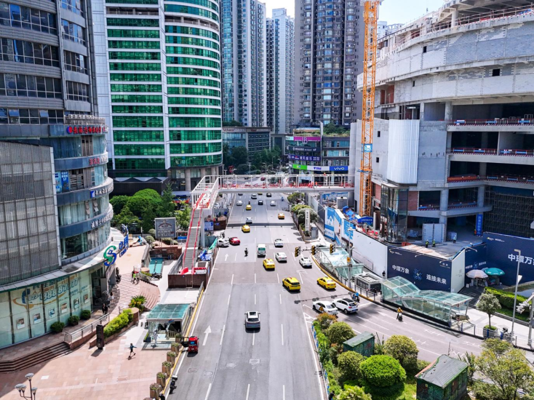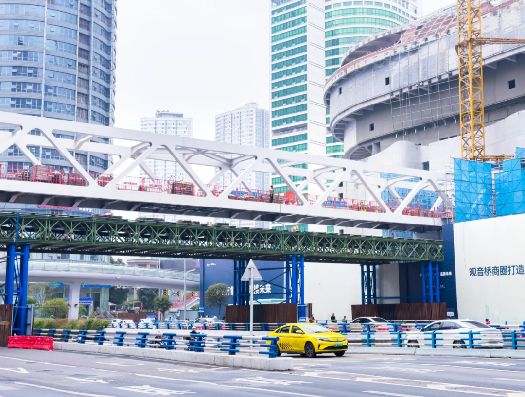 目前,观音桥商圈空中连廊项目一期,嘉陵公园段和茂业百货段正在同步进行幕墙龙骨焊接和顶面防水保温层施工,累计形象进度约85%。