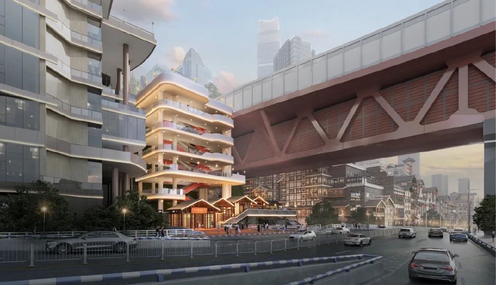棉花街片区项目将新建平台连接洪崖洞4层,以疏导景区人流,并设旋转车道连接洪崖洞车库与嘉滨路,缓解道路拥堵、提升疏散效率。