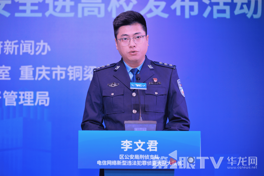 铜梁区公安局刑侦支队电信网络新型违法犯罪侦查大队大队长李文君现场解析校园诈骗套路。第1眼TV-华龙网 董静 摄