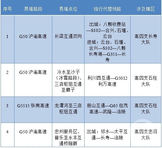 为保障广大群众春运期间出行安全,1月12日,重庆市公安局交巡警总队高速公路四支队公布了渝东片区(长寿、涪陵、丰都、石柱、忠县、垫江等)高速公路的出行提示和易堵路段,提醒市民合理安排出行时间、路线、方式,谨慎驾驶,平安出行,平安回家。