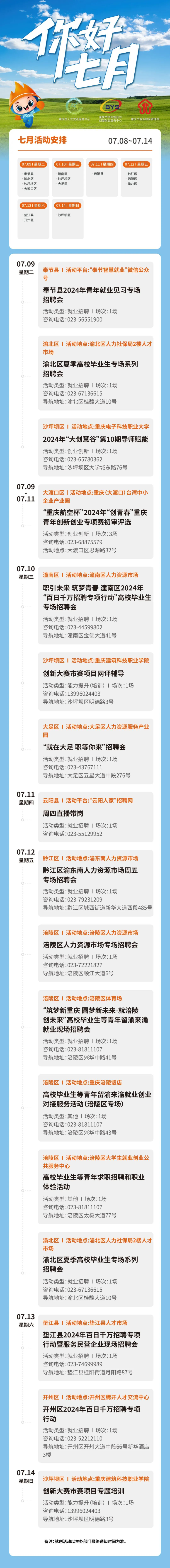 重庆人社微信公众号消息,本周,全市共13场大学生就业创业活动。其中,包括江津区2024年高校毕业生网络招聘会、渝北区人社月月大讲堂第三十二期、高校毕业生等青年留渝来渝就业创业对接服务活动(万州区专场)等,期待你的参与!