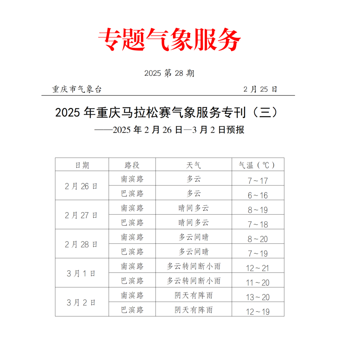 据重庆市气象台预报,2025重马领物(2月27日-3月1日)至赛事(3月2日)期间,天气以多云为主,气温 8℃- 20℃。比赛当天或有降雨,气温 13℃- 20℃。请广大选手提前备好装备,穿着轻便跑鞋,合理规划出行,做好相应防护准备,确保安全顺利参赛。