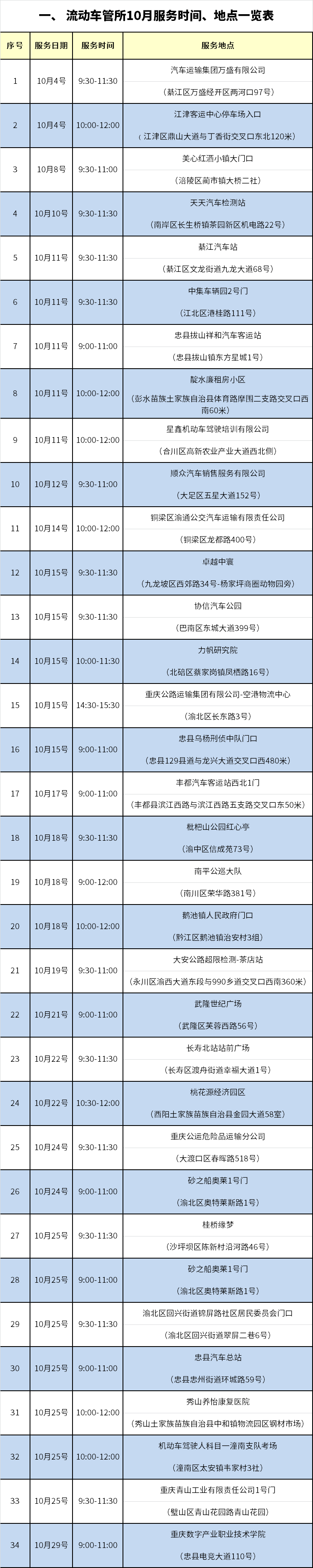 为方便驾驶人办理补(换)证、变更备案、抵押(解除)登记、摩托车检验等车驾管相关业务,市公安局交通管理局制定了流动车管所2025年10月服务计划,将组织34场车驾管上门服务,请市民根据业务办理需求,查看服务时间,按时前往办理相关业务。