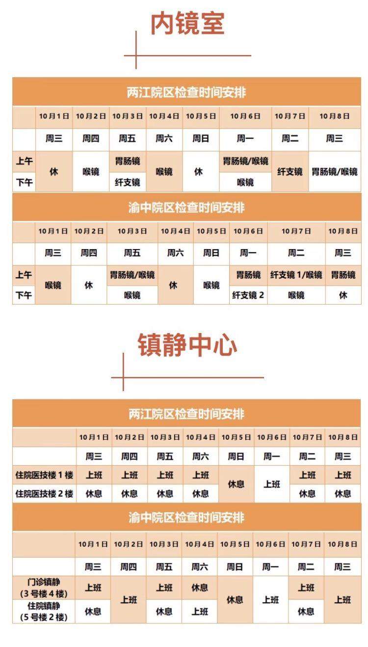 肿瘤科、内分泌科、消化内科、心血管内科、神经内科、肝胆胰腺外科、肾内科、普通外科、核医学科、康复医学科:10月1日—8日上午应诊;