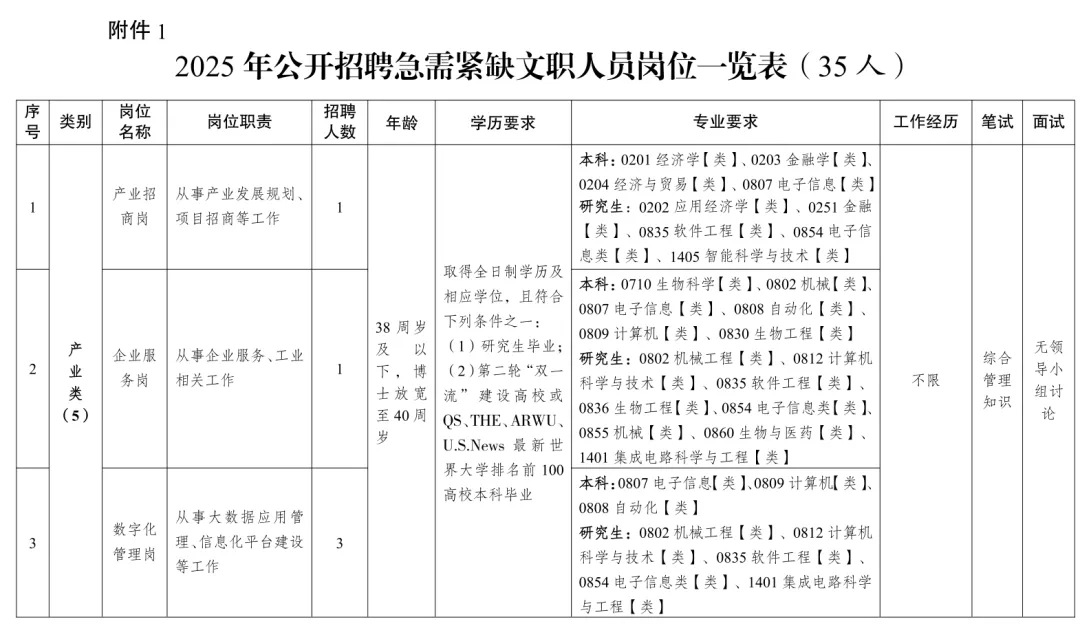 本次面向社会公开招聘急需紧缺人才35名,具体岗位条件详见《西部科学城重庆高新区2025年公开招聘急需紧缺文职人员岗位一览表》(附件1)。