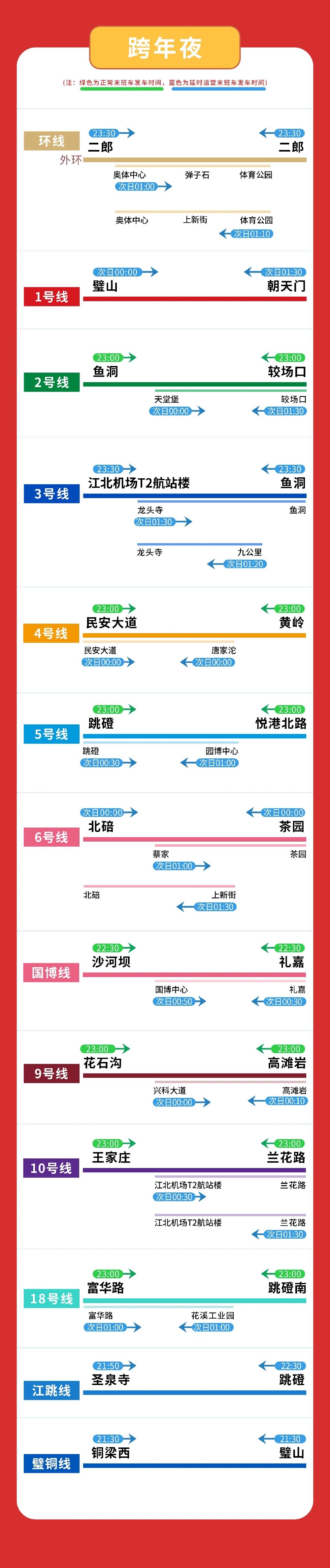 12月31日跨年夜期间,线网13条线路采取分方向、分区段、差异化延时运营。各线路延时时长为1小时10分至2小时30分不等。具体情况如下: