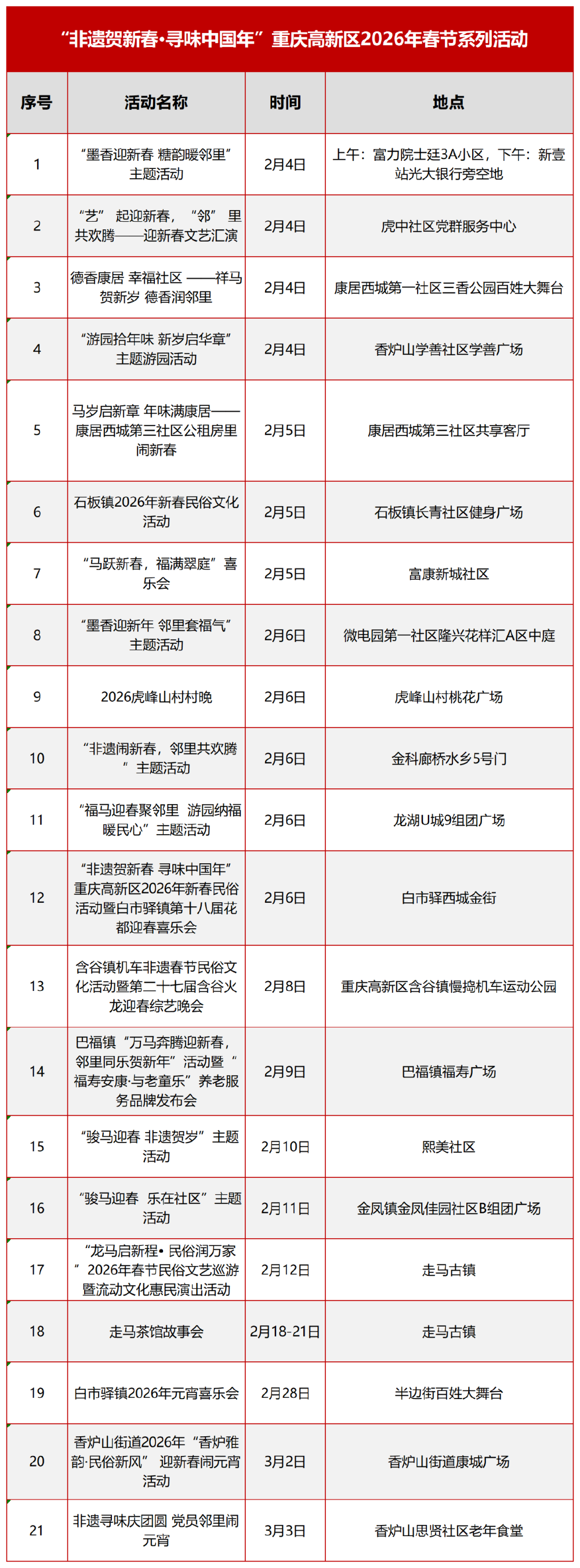 为充分发挥春节作为国家级非物质文化遗产代表性项目的文化引领作用,重庆高新区正式启动“非遗贺新春 寻味中国年”2026年春节系列活动。活动以“区级主会场+镇街分会场”为架构,全区从2月4日至3月3日期间,开展21场新春活动,邀请大家一起感受热闹精彩、喜乐祥和的年味!