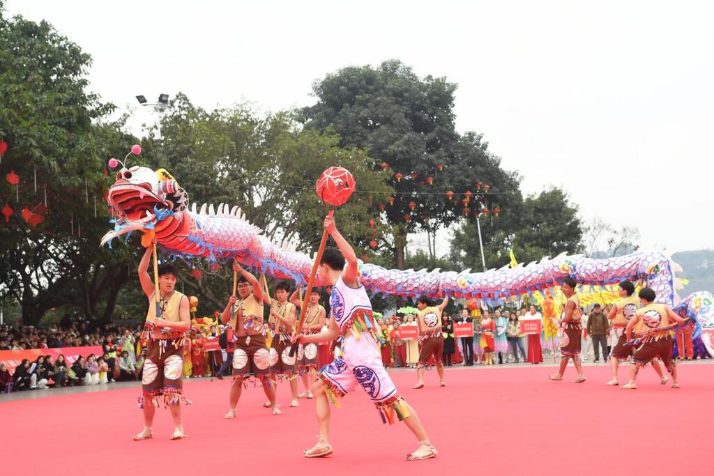 五大特色节目轮番上阵,尽显川渝民俗魅力。《鼓舞丰收》铿锵启幕,以激昂鼓点暖场开篇;《锦绣白沙》锣鼓齐鸣,本地团队演绎民俗风韵;《锦鲤戏春》灵动登场,槽坊社区鲤鱼灯队俏皮献艺。更有《二龙戏珠》《龙腾四海》等节目依次亮相,各团队同台竞彩,传统民俗与现代演绎巧妙交融,勾勒出锦绣白沙的幸福图景。
