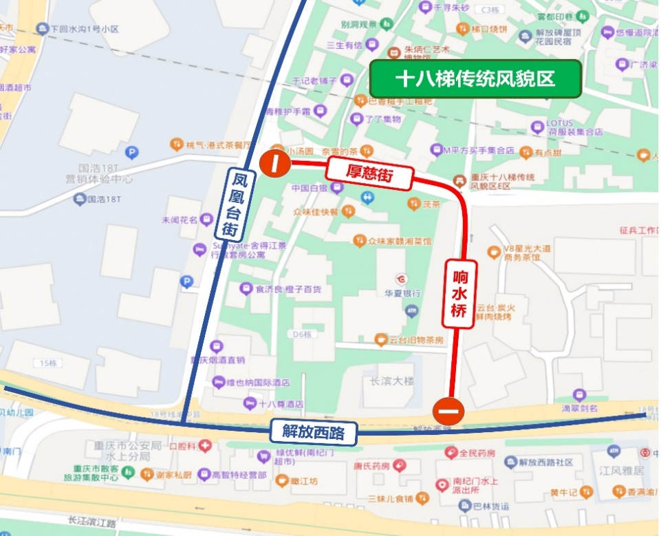 嘉陵江滨江路洪崖洞段限时通行示意图。