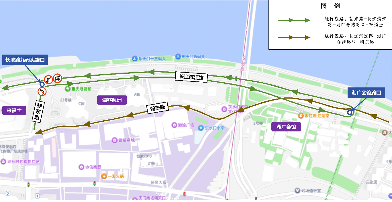 每日17:00至24:00,根据实际情况禁止车辆在长江滨江路九码头路口左转往朝东路方向及掉头,禁止朝东路车辆左转往长江滨江路方向行驶。