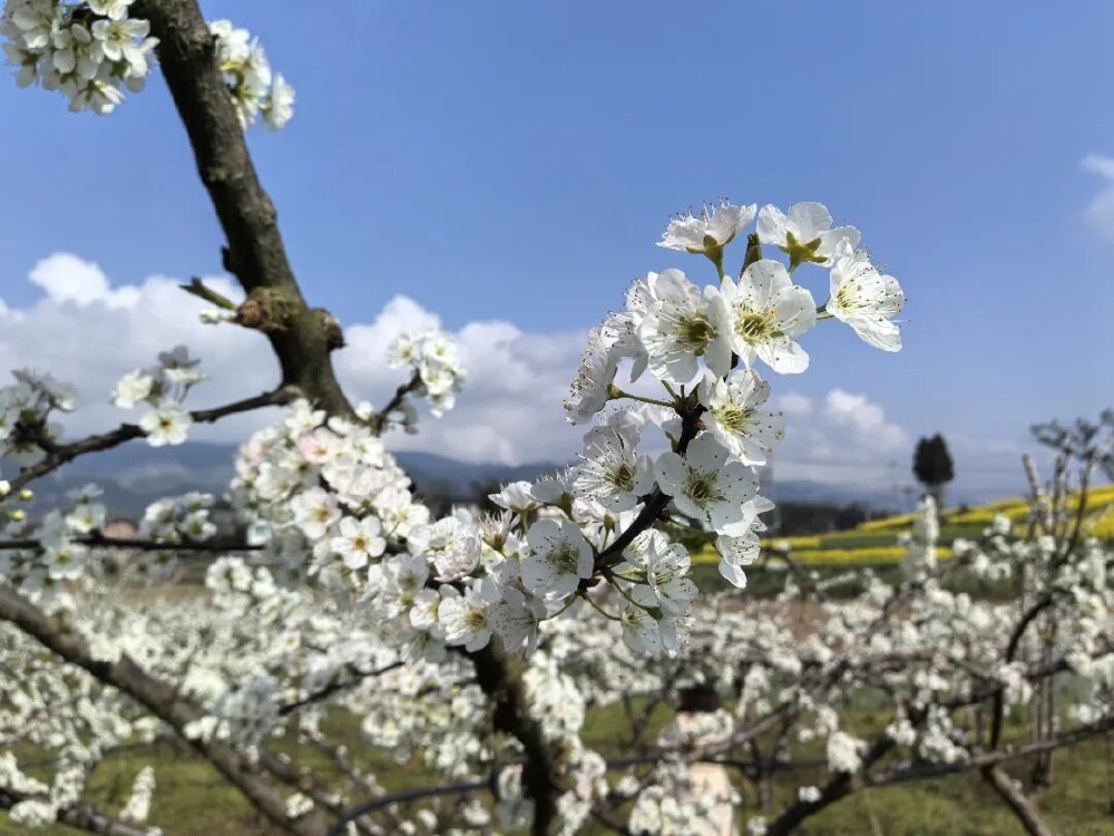 成片李树沿山坡层层铺展,洁白花朵缀满枝头,嫩黄花蕊点缀,花香清甜。远眺如白色花海,与青山、农舍相映,治愈感拉满。