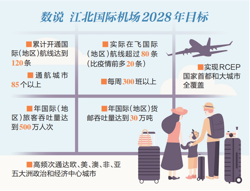 据介绍,计划到2028年,江北国际机场累计开通国际(地区)航线达到120条,通航城市85个以上;实际在飞国际(地区)航线超过80条(比疫情前多20条),每周300班以上,高频次通达欧、美、澳、非、亚五大洲政治和经济中心城市,实现RCEP国家首都和大城市全覆盖;年国际(地区)旅客吞吐量达到500万人次,年国际(地区)货邮吞吐量达到30万吨。