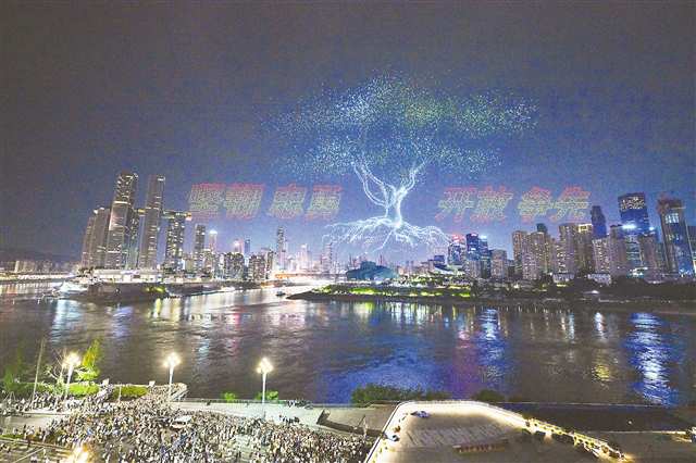 这场震撼人心的无人机灯光秀,规模在全球范围内屈指可数,不仅是无人机行业技术创新的重大突破,还兼具人文艺术的融合,在夜空中展现出重庆的创新活力与人文魅力。据估算,当晚有超过10万人在现场观看了表演。
