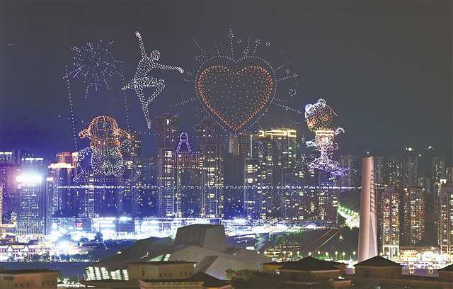 6月17日晩,无人机组成卡通人物。记者 熊明 摄\视觉重庆