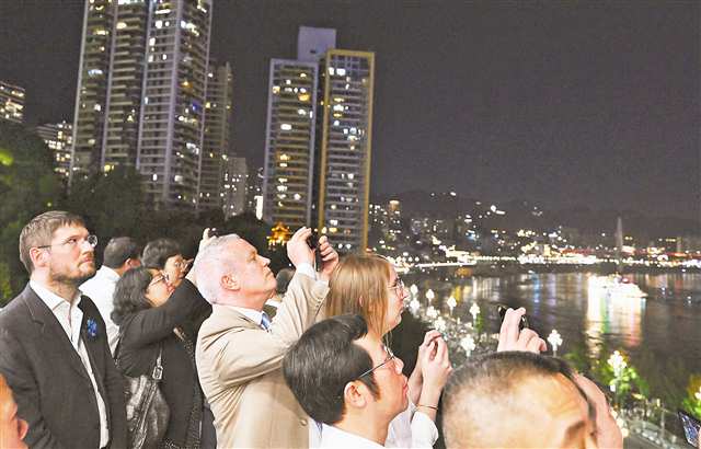 6月17日晚,外国嘉宾在观看无人机灯光秀表演。首席记者 龙帆 摄\视觉重庆