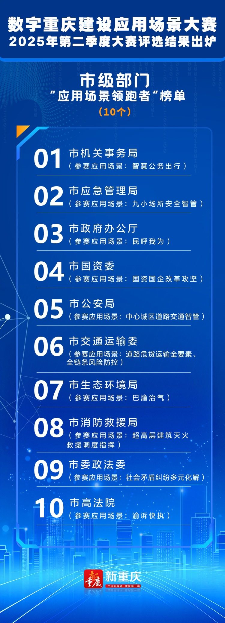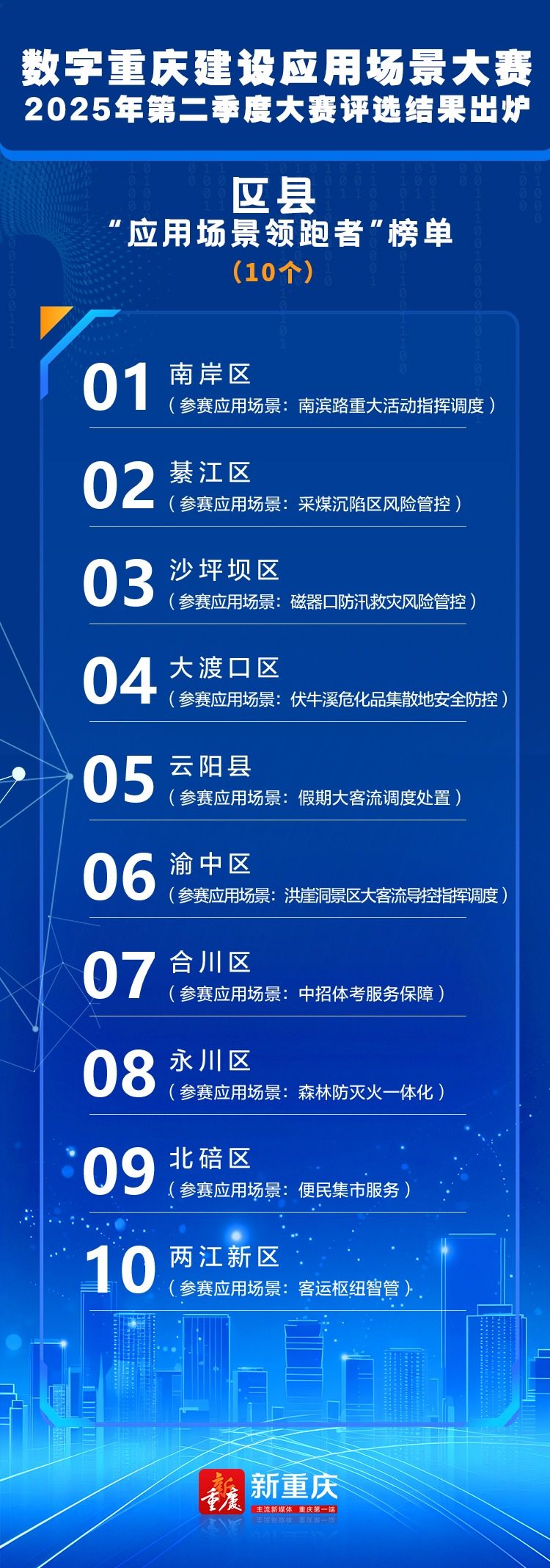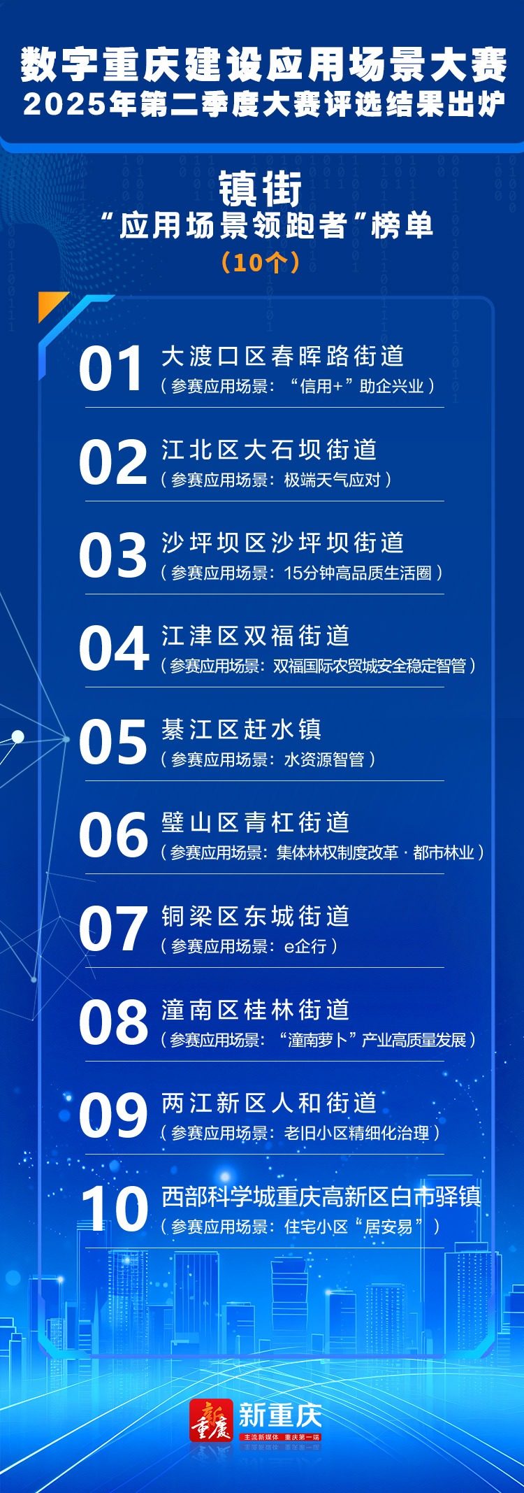 为进一步深化实化数字重庆基本能力建设,强化“以赛促建、以赛促用”,市委改革办会同基层智治专题组组织开展了数字重庆建设应用场景大赛2025年第二季度大赛,评选出“应用场景领跑者”榜单,现公布如下: