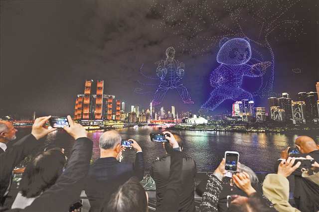 10月27日晚,“新韵重庆”无人机灯光秀带来了一场以“人民城市 智绘未来”为主题的专场展演。展演以大熊猫为主角,通过拟人化的创意形式,向中外嘉宾呈现重庆作为创新之城、宜居之城、美丽之城、韧性之城、文明之城与智慧之城的多元形象。