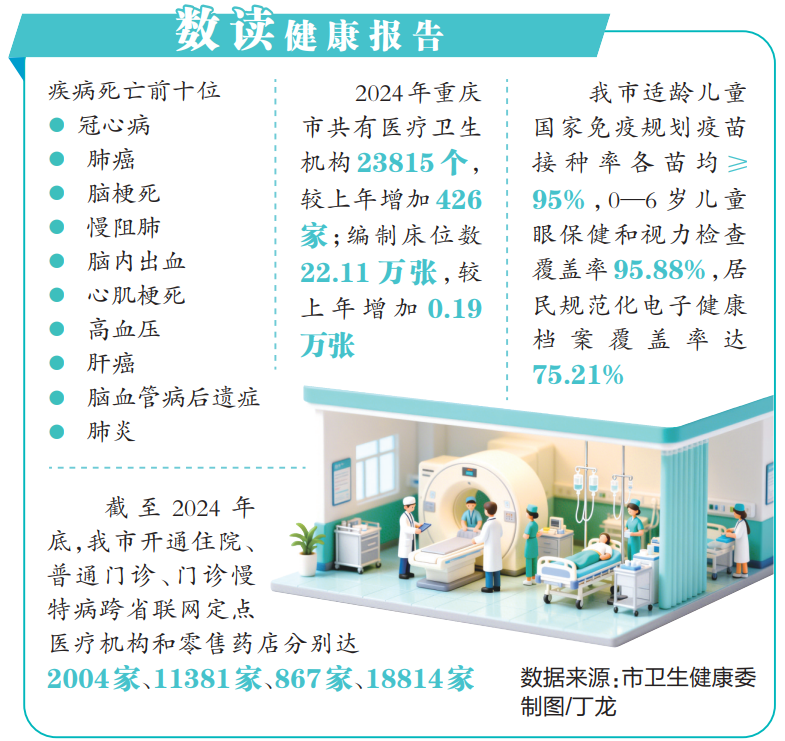 “近年来,我市加快建设15分钟健康服务圈,群众就近就便获取优质医疗服务的可及性显著提升。”市卫生健康委有关负责人称,2024年重庆市共有医疗卫生机构23815个,较上年增加426家;编制床位数22.11万张,较上年增加0.19万张;卫生技术人员28.35万人,较上年增加1.15万人;其中执业(助理)医师数10.87万人,较上年增加0.65万人;注册护士13.31万人,较上年增加0.5万人。
