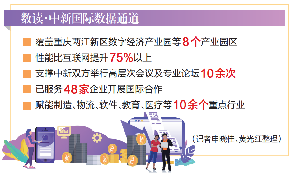 中新国际数据通道于2019年2月获批启动建设,同年9月正式开通运行,是我国首条针对单一国家“点对点”的国际数据专用通道,具备高速率、大带宽、低时延、高可靠等特点,已覆盖重庆8个产业园区,服务48家企业开展国际合作。