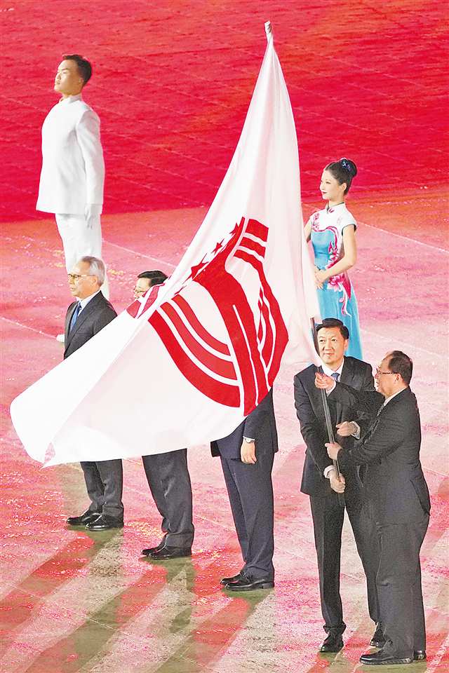 这是11月21日拍摄的闭幕式上的中华人民共和国运动会会旗交接仪式。新华社发